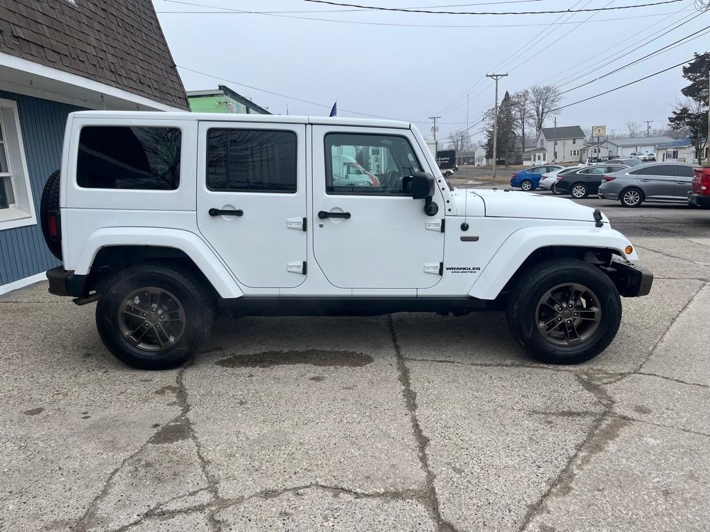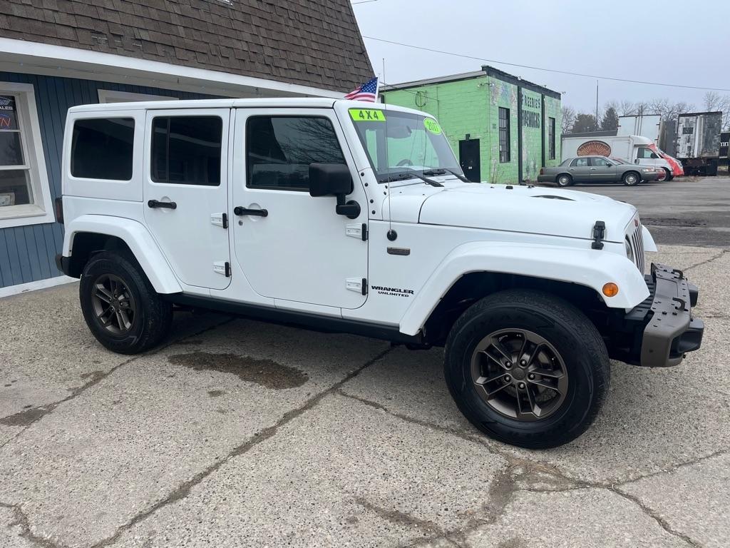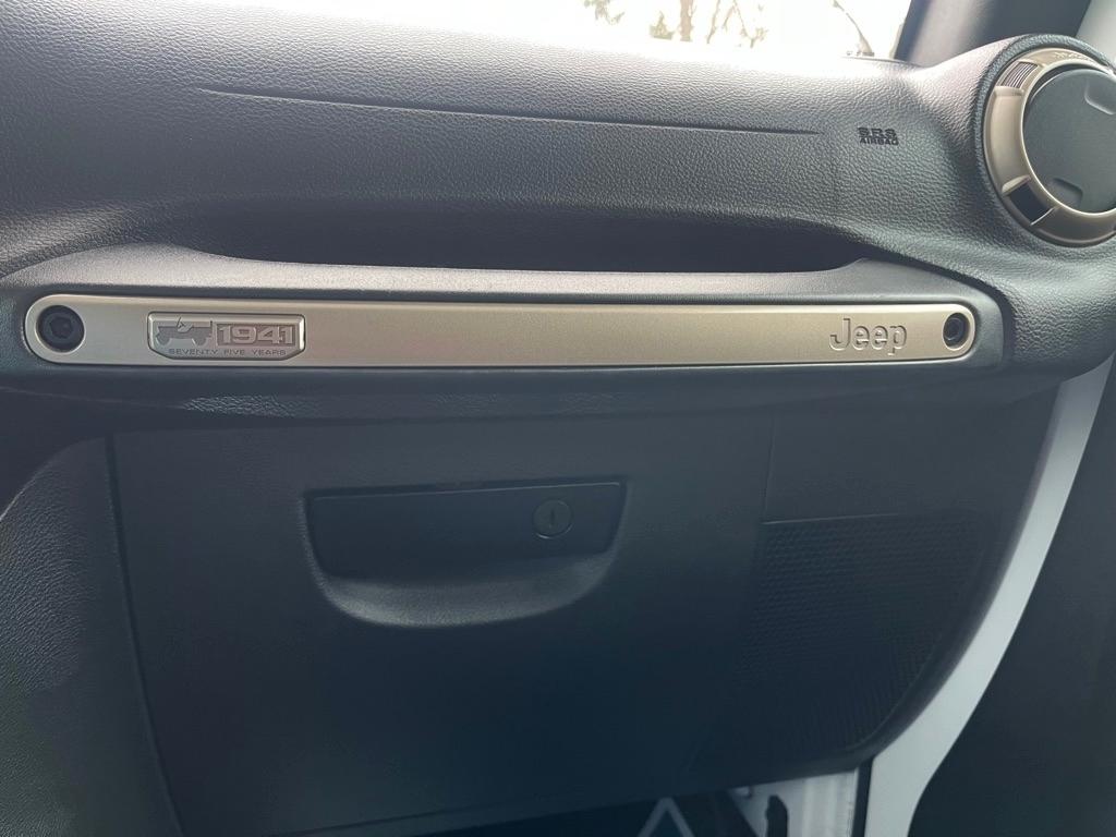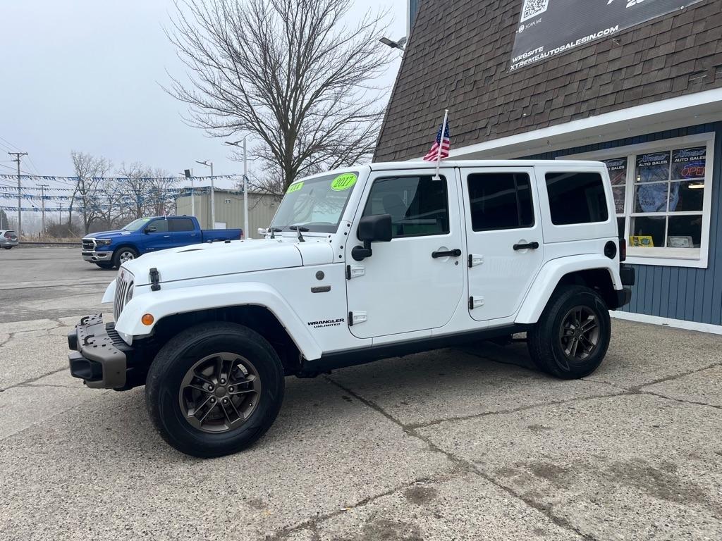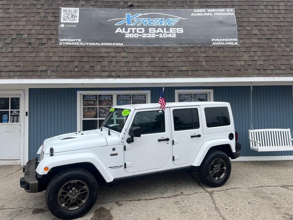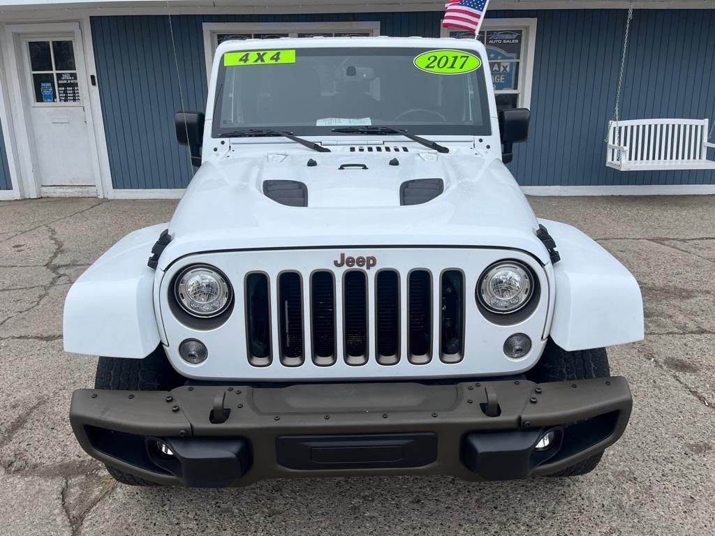 2017 JEEP WRANGLER UNLIMITED SAHARA 4X4 Exterior Color: Bright White Clear Coat Exterior Paint Interior Color: Black Interior Color Interior: Leather Seats with Ombre Mesh Inserts Engine: 3.6-Liter V6 24-Valve VVT Engine Transmission: 5-Speed Automatic TransmissionJeep 75th Anniversary Edition 24H $4,680 17-Inch x 7.5-Inch Bronze Aluminum Wheels P245/75R17 OWL On / Off-Road Tires Trac-Lokr Differential Rear Axle,Bronze Steel Front Bumper,Bronze Steel Rear Bumper Rock Rails,Bronze 2 Front and 1 Rear Tow Hook,'75th Anniversary'' Badge,Body-Color Grille with Bronze Accents,Bronze ''Jeep'',Grille Badge,Bronze ''Trail Rated'' Badge,,Moroccan Sun Interior Accents,Moroccan Sun Instrument Panel BezelIP Grab Handle with 75th Anniversary Logo,Chrome / Leather-Wrapped Shift Knob,Connectivity Group Tire Pressure Monitoring DisplayUconnectr Voice Command with Bluetoothr Electronic Vehicle Information Center Heated Front Seats Power Dome Hood All-Weather Slush Mats Premium Black Sunriderr Soft Top Radio 430 Remote USB Port Sunriderr Soft Top Low Gloss Black Wrangler Decal Trailer Tow Group $495 Class II Receiver Hitch Trailer Tow with 4-Pin Connector Wiring 5-Speed Automatic Transmission $1,400 Hill Descent Control 3.73 Front / Rear Axle Ratio $695 Air Conditioning with Automatic Temperature Control $395 Freedom Topr Body-Color 3-Piece Hard Top $1,595 Delete Sunriderr Soft Top Freedom Panel Storage Bag Rear Window Defroster Rear Window Wiper / Wash Alpiner Pre